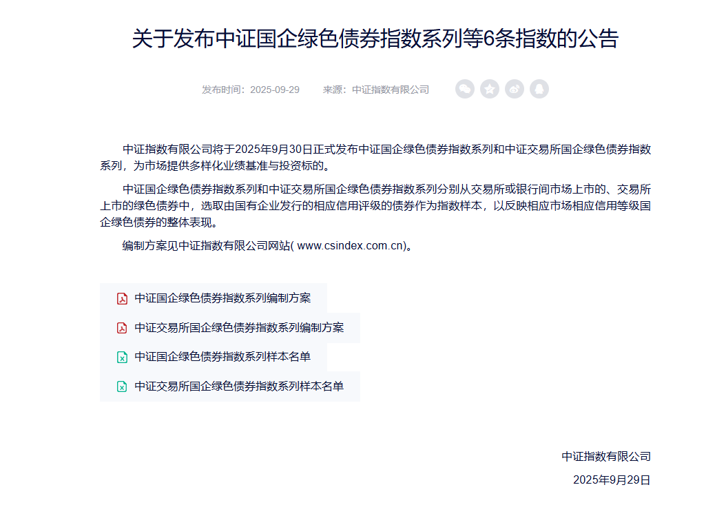 9月29日,据中证指数有限公司消息,中证指数有限公司将于2025年9月30日正式发布中证国企绿色债券指数系列和中证交易所国企绿色债券指数系列,为市场提供多样化业绩基准与投资标的。